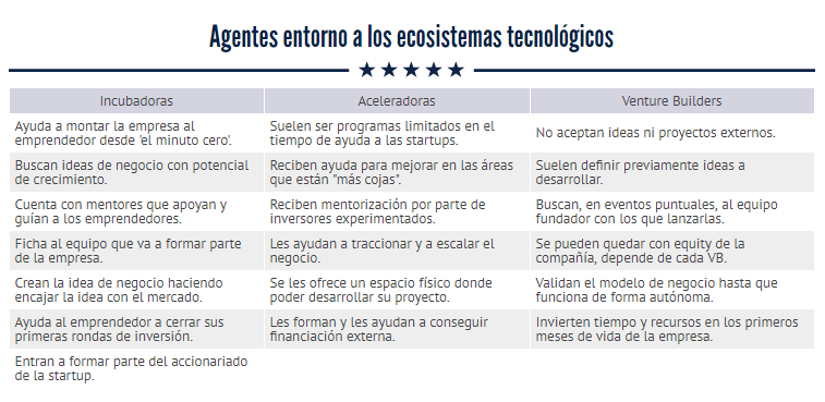 De entre todas las iniciativas existentes, sobresalen principalmente tres tipos de agentes de apoyo al emprendedor: aceleradoras, incubadoras y venture builders.