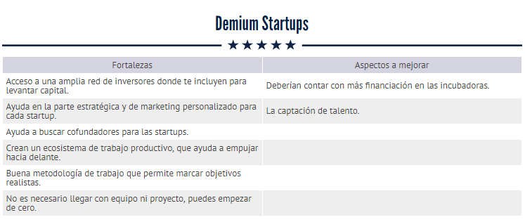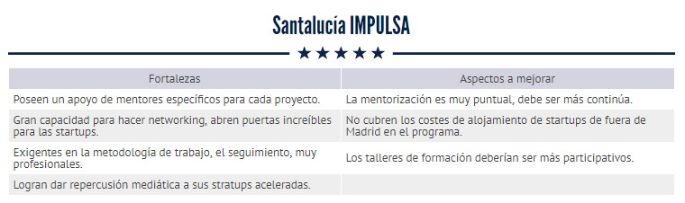 A continuación, se detallan de forma ordenada las iniciativas mejor valoras por los emprendedores españoles y algunos inversores relevantes del sector, donde se señala el tipo de iniciativa, así como una pequeña descripción de los servicios que ofrece cada una a los emprendedores y sus puntos fuertes y débiles.