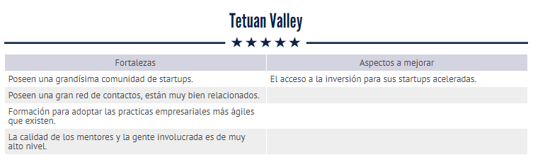 Tetuan Valley es una aceleradora de startups dirigida por Karel Escobar con sede en Campus Madrid, que ayuda a startups de internet, software, apps o marketplaces a lanzar sus prototipos durante el proceso de aceleración. A través de seis sesiones reciben charlas de mentores y emprendedores. Al finalizar, las compañías se gradúan y comienzan a formar parte de la comunidad de Tetuan Valley.