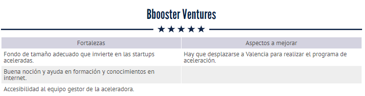 Bbooster Ventures, aceleradora con sede en Valencia y dirigida por Enrique Penichet, persigue el impulso de nuevas ideas que basan su modelo de negocio en internet y en las apps móviles. No es imprescindible que las startups estén creadas, lo importante es el potencial del equipo y la capacidad de crecimiento de su mercado.