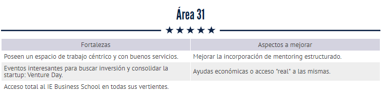 Área 31 es la incubadora del IE Business School y la dirige Conchita Galdón. Destaca por ofrecer tutorías, pitching slams de acceso libre con inversores llamados Venture Networks, conferencias, eventos con partners corporativos que apoyan el emprendimiento y la innovación, o hackathons y reuniones de programadores. Se realizan dos convocatorias para captar proyectos al año: en noviembre y en abril.