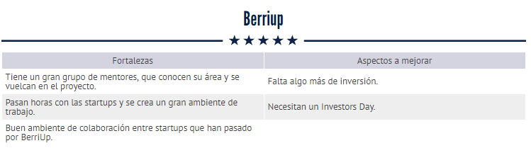 Berriup es una aceleradora privada dirigida por Pedro Muñoz Baroja, que busca apoyar a los emprendedores a lanzar sus proyectos al mercado. Ofrece una inversión de 50.000 euros a cambio del 10% de la startup y un programa de cuatro meses que incluye: mentores, espacio coworking, formación y asesoramiento.