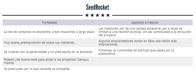 El programa más relevante que organizan es el Campus de Emprendedores, que cuenta con convocatorias en Barcelona y otra en Madrid. SeedRocket proporciona formación, financiación y asesoría para potenciar el desarrollo de las startups, así como un espacio común de trabajo en el espacio Barcelona Activa y en Campus Madrid. La aceleradora no se lleva equity de las startups en ningún caso.