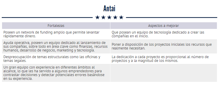 Antai es el venture builder de referencia en España y Latinoamérica puesto en marcha por Gerard Olivé y Miguel Vicente, centrada en la creación de startups bajo un modelo internacional, online y mobile. Su actividad se centra en analizar el mercado en busca de negocios de éxito probado y, una vez identificados, implantarlos en otros mercados. Para conseguirlo, seleccionan a los profesionales más preparados y les ayudan a emprender, acompañándolos a través de un servicio integral, que incluye el desarrollo de negocio, business inteligence, financiero, legal, aportando los medios, así como la búsqueda y contratación del personal necesario.
